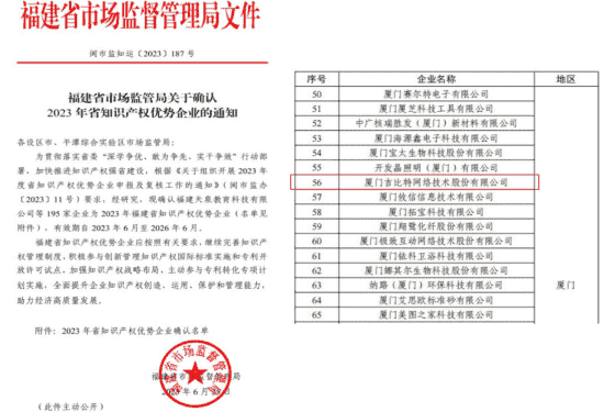 近日,,,,福建省市場監督管理局公示了2023年福建省知識產權優勢企業名單,,,廈門35273網絡技術股份有限公司(以下簡稱“35273”或“公司”)榜上有名。。。。
