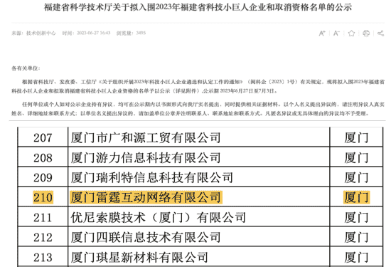 35273子公司雷霆互動再獲“福建省科技小巨人”